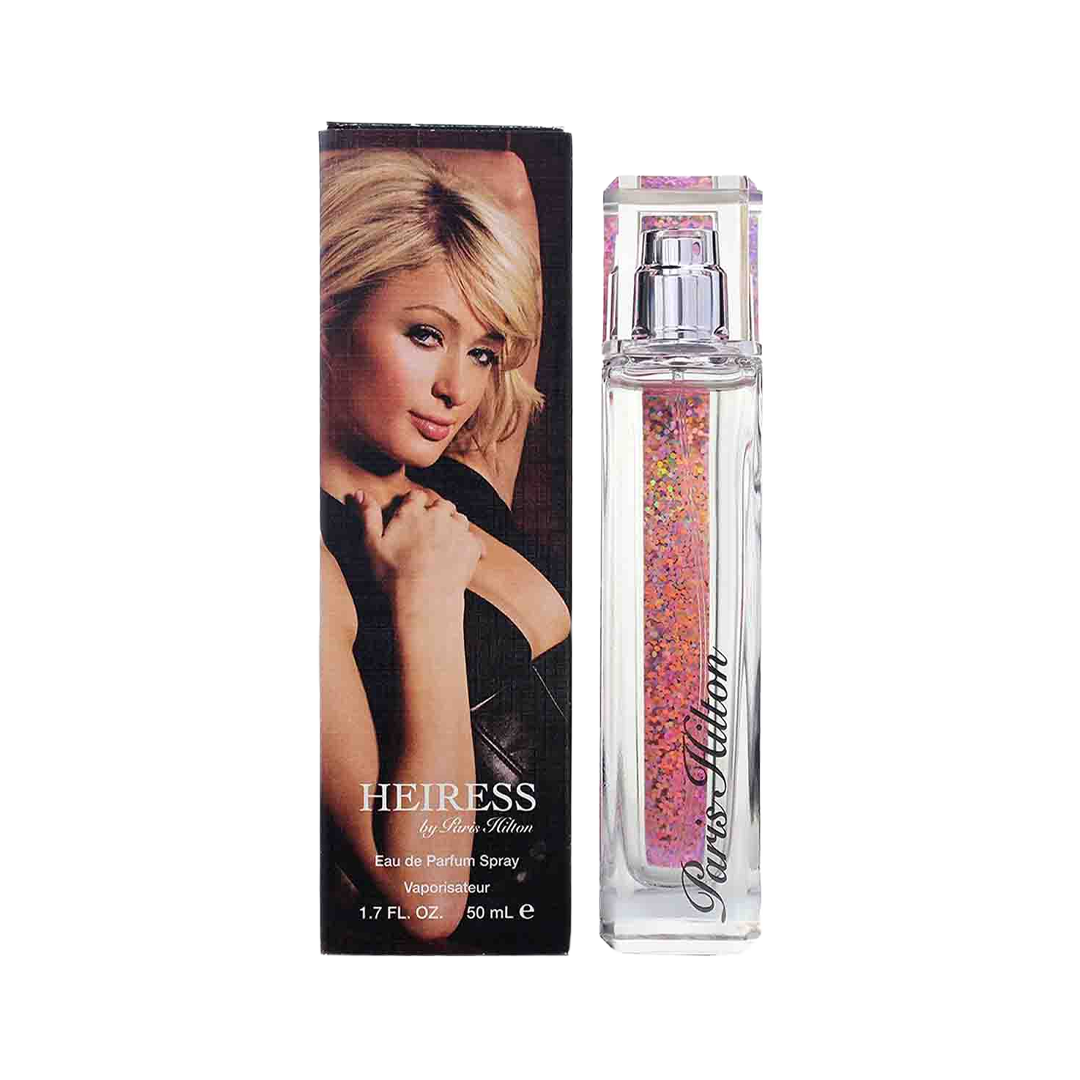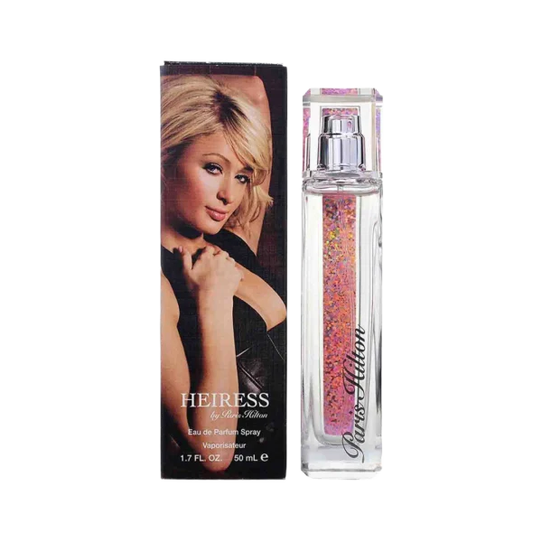 Heiress de Paris Hilton es una fragancia de la familia olfativa Floral Frutal para Mujeres. Heiress se lanzó en 2006. Heiress fue creada por Steve DeMercado y Fragrance Resources. Las Notas de Salida son champaña, maracuyá (fruta de la pasión), durazno (melocotón), naranja y mimosa; las Notas de Corazón son granadina, flor de tiaré, ylang-ylang, madreselva y jazmín de estrella; las Notas de Fondo son haba tonka, hojas de violeta y maderas blancas.
